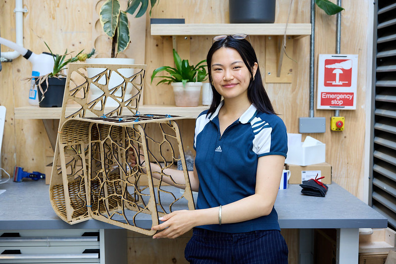 The form is inspired by trellises, the vertical shape of which helps climbing plants to grow. Two patterns are used here, a more irregular pattern derived from the veins of leaves that represents nature, and a triangular tessellation that represents the industrial construction of humans. Together, these two patterns intersect and support one another to form the chair. One is not possible without the other.