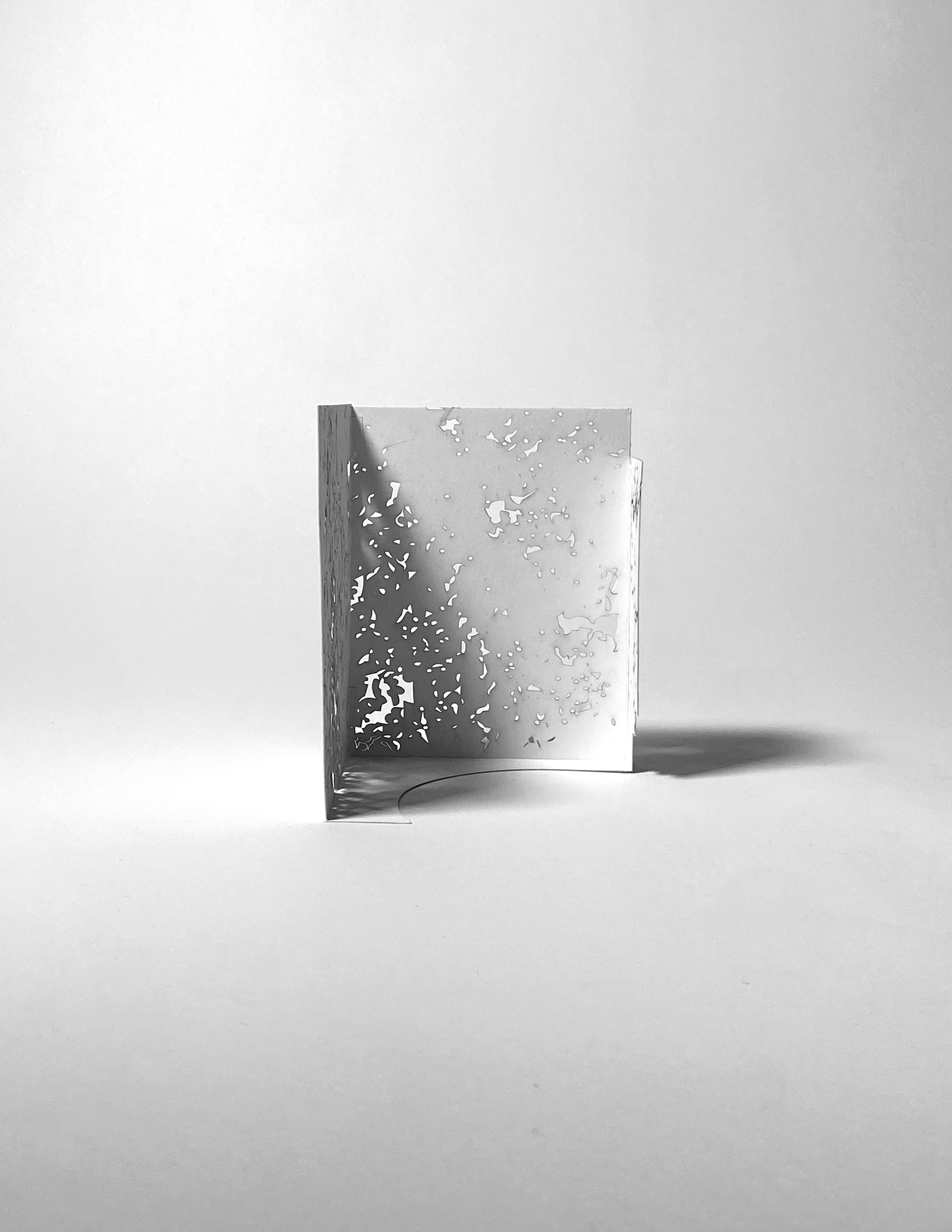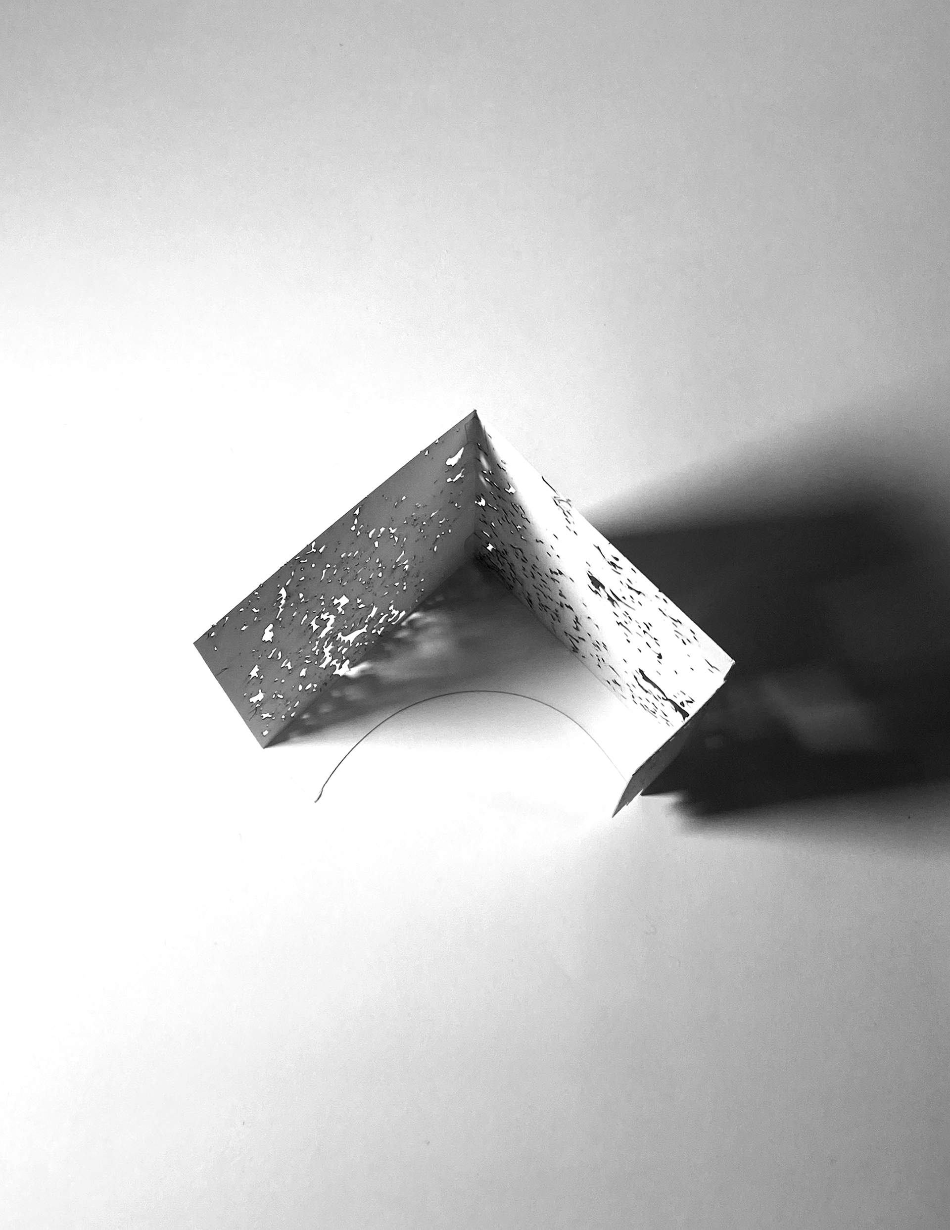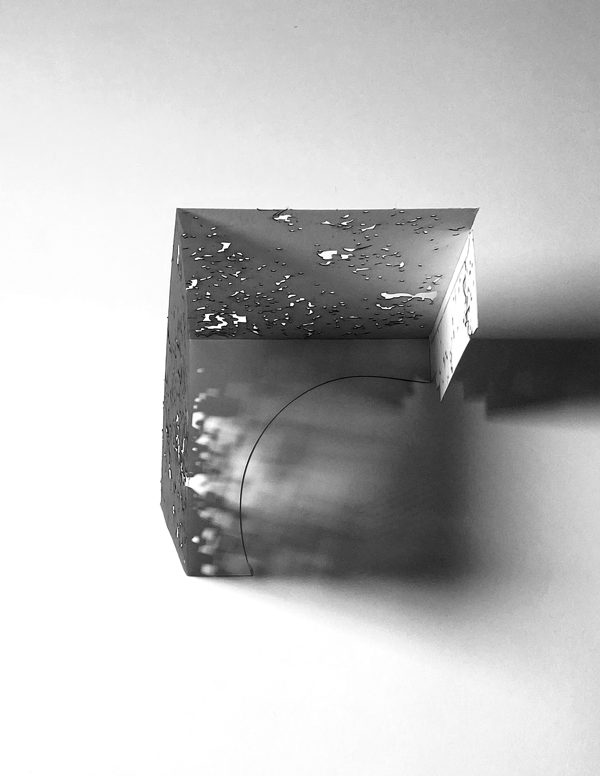 The project began with a fascination for East Rock’s iron-rich stone—its shifting color, its layered texture. Two aspects guided my investigation: color, explored through a weathering Corten-steel façade that rusts over time to match the rock’s deep orange tone; and texture, translated through perforations patterned directly from the stone’s surface. A single aperture lofts upward into intersecting trapezoidal forms, drawing light into the carved volume. Dappled light fi lters through the perforations, animating the interior and allowing the occupant to experience the geology of East Rock from within.