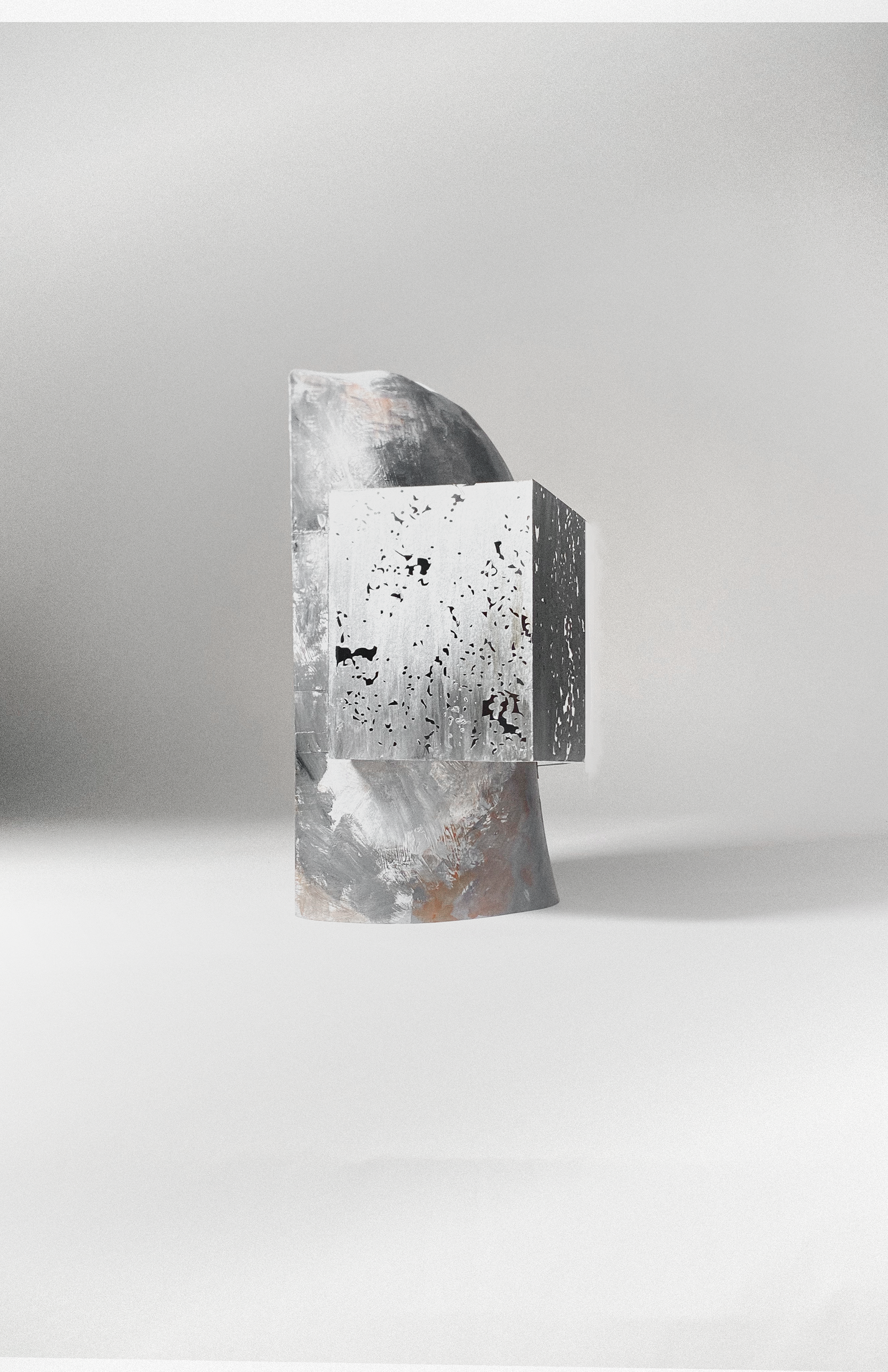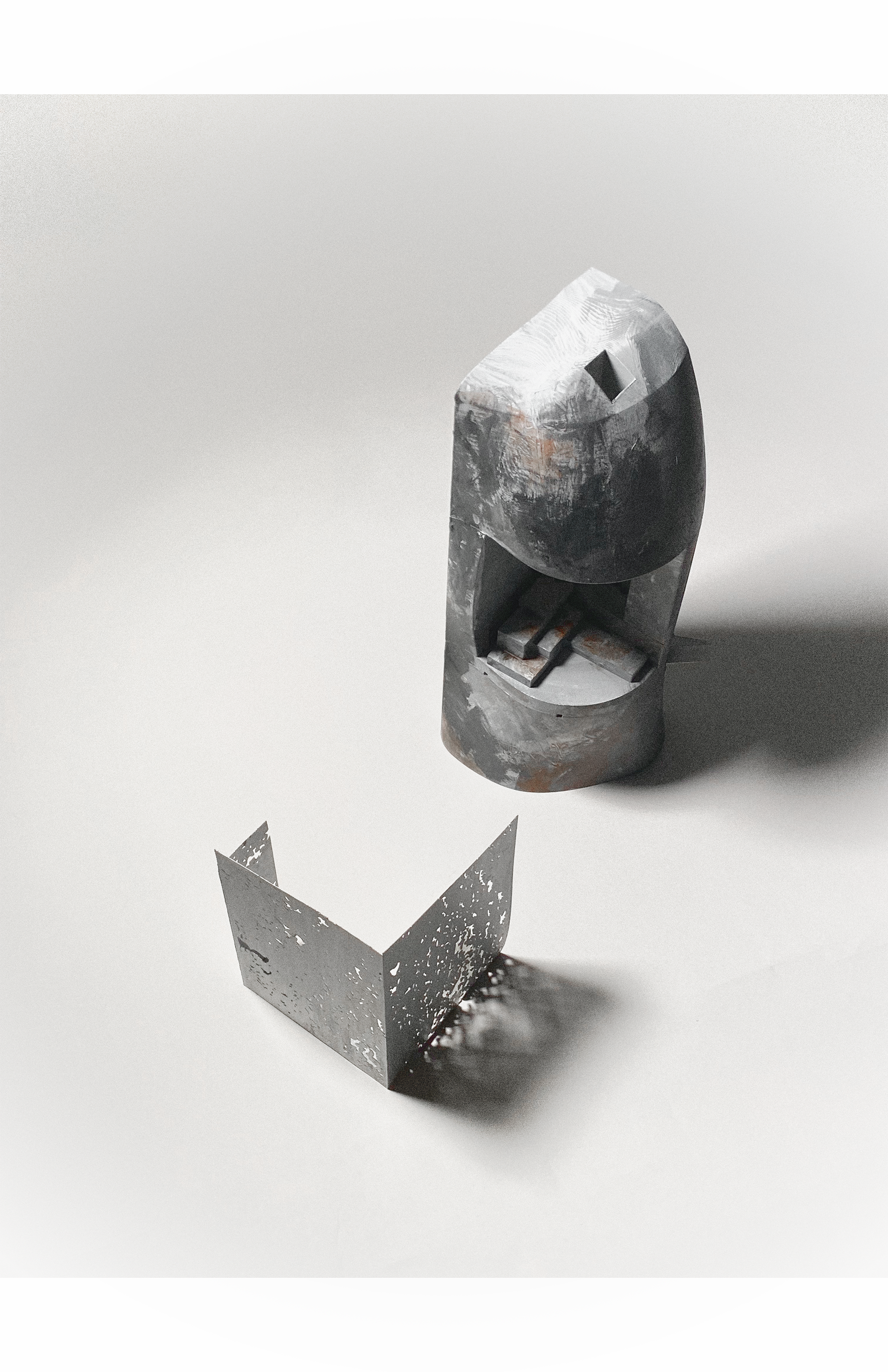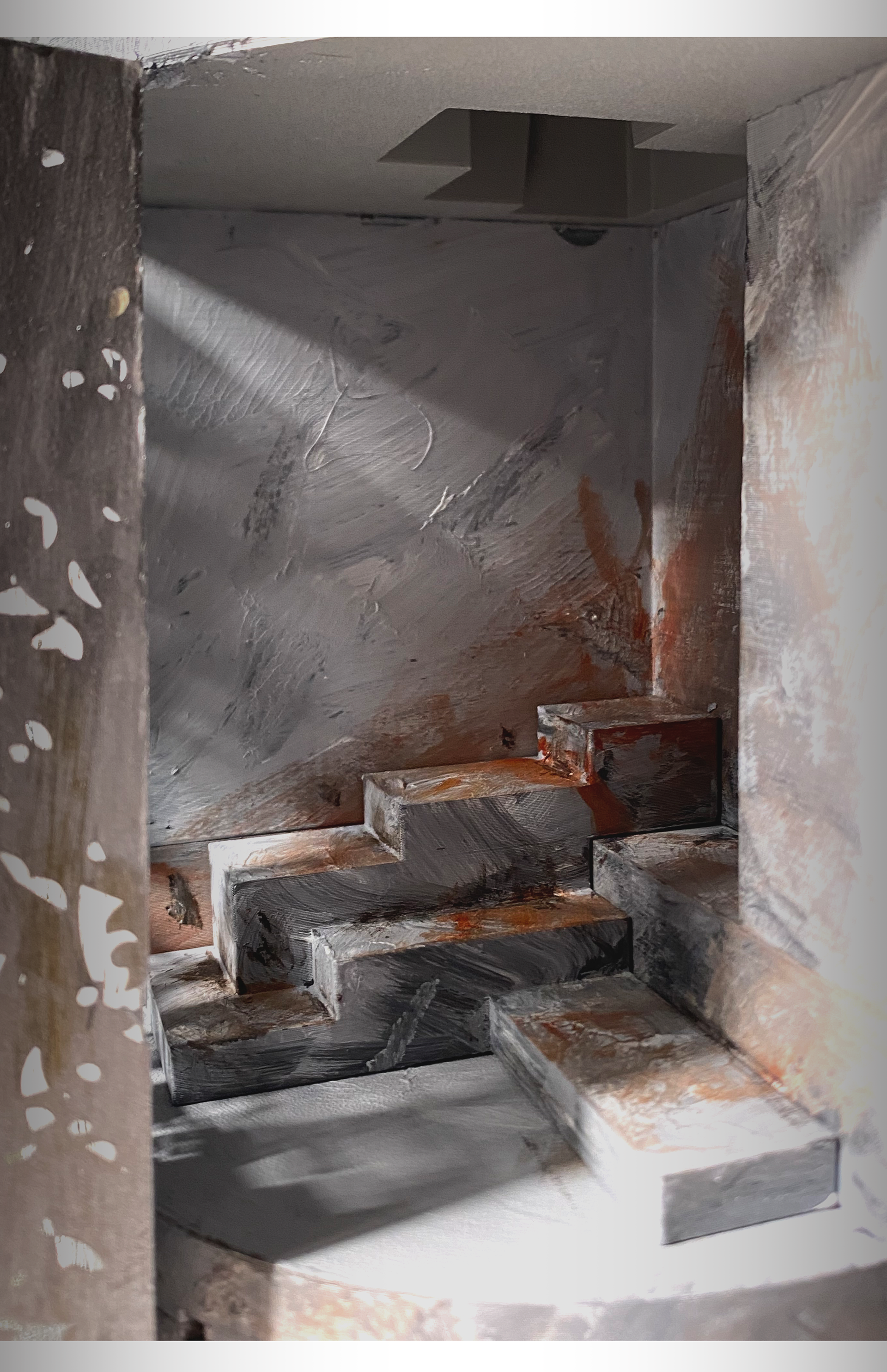 The project began with a fascination for East Rock’s iron-rich stone—its shifting color, its layered texture. Two aspects guided my investigation: color, explored through a weathering Corten-steel façade that rusts over time to match the rock’s deep orange tone; and texture, translated through perforations patterned directly from the stone’s surface. A single aperture lofts upward into intersecting trapezoidal forms, drawing light into the carved volume. Dappled light fi lters through the perforations, animating the interior and allowing the occupant to experience the geology of East Rock from within.