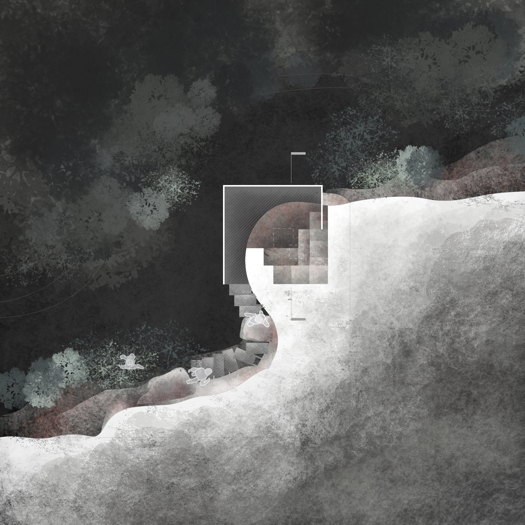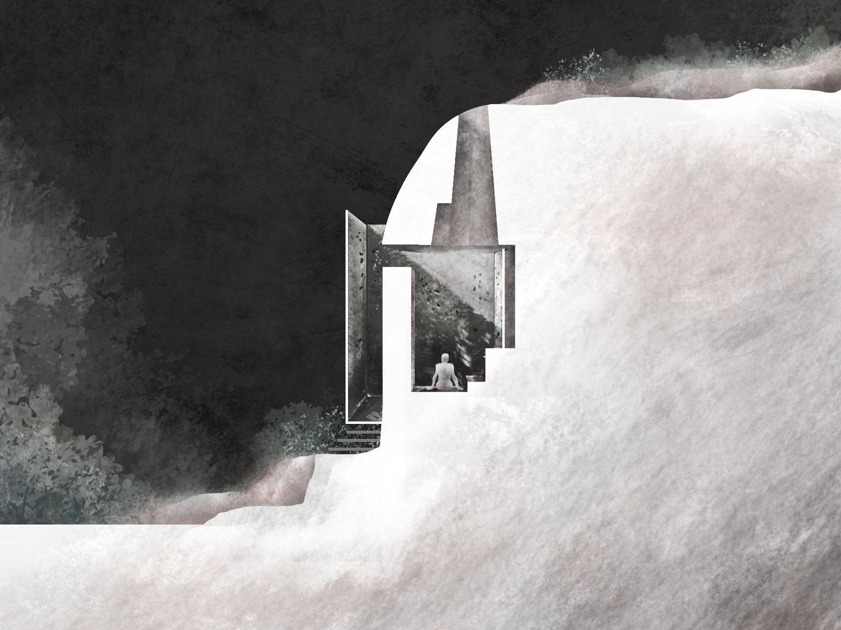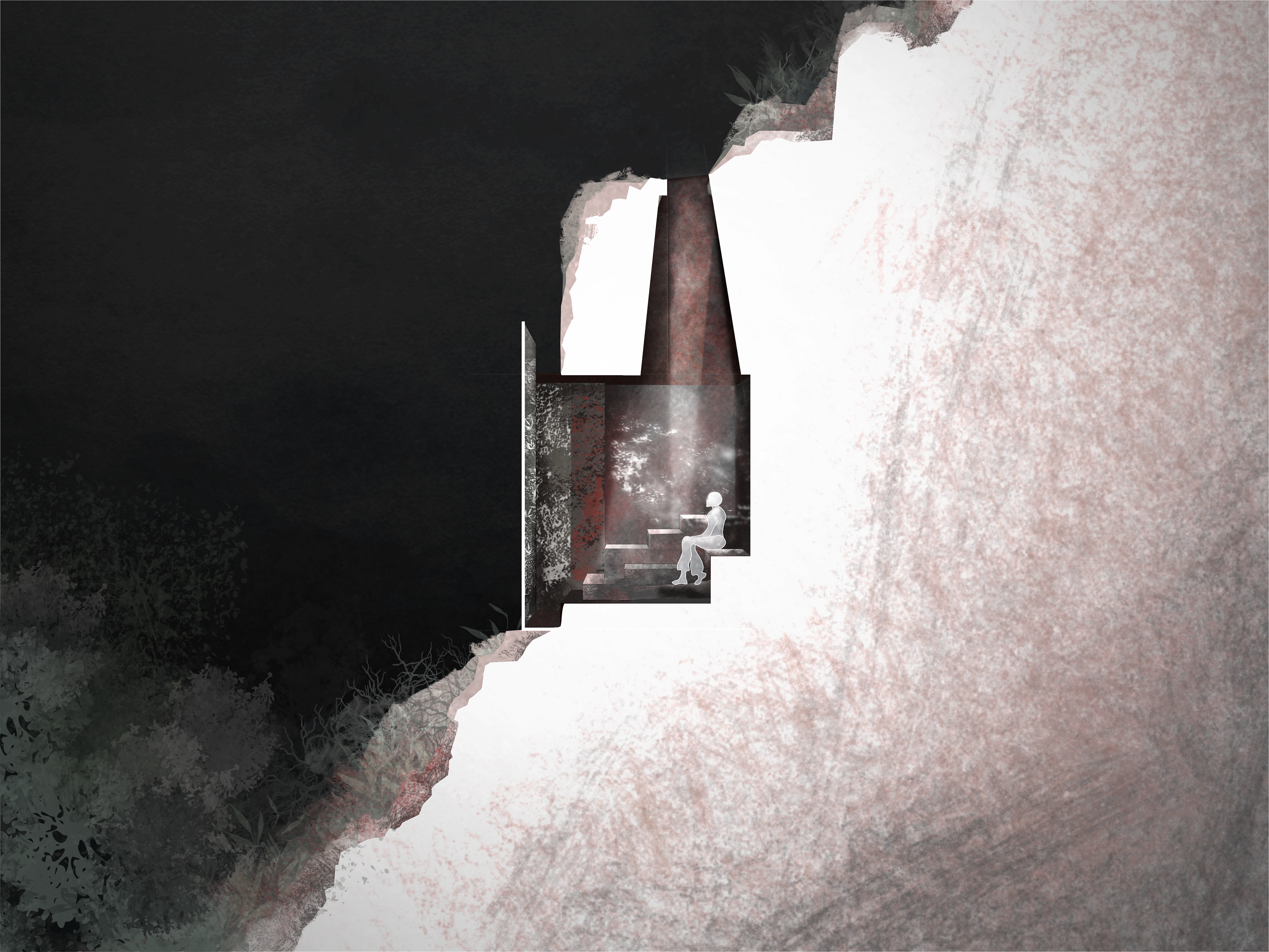 Carved into the cliff face of East Rock Park, this project explores how the human body inhabits geological space. Conceived as a temporary refuge for a single occupant, the design mediates between two scales: the intimacy of the body and the vastness of the landscape. The structure does not sit on the rock, but within it—an architecture of subtraction rather than addition.